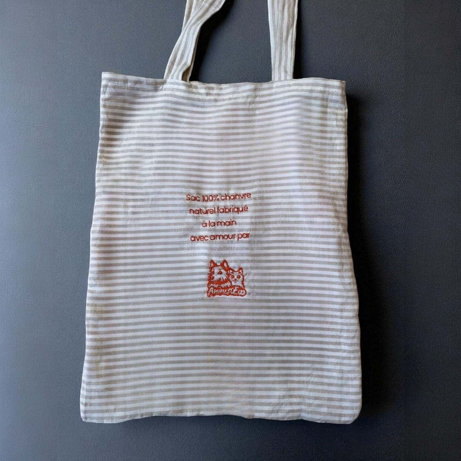 Ce sac cabas est confectionné à la main dans notre atelier, avec un tissu 100% chanvre naturel, teint avec des pigments végétaux.