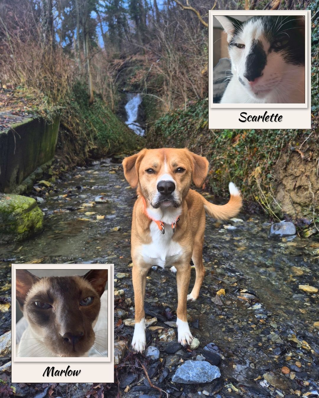 Tous les soirs, c’est sortie avec ma bande de potes de 13 chiens. Courir, explorer, m’amuser… c’est mon truc. Et en plus à la maison, j’ai mes deux acolytes félins: Marlow et Scarlette. Scarlette est un vrai chat-chien, elle adore jouer et rapporter ses balles comme moi.